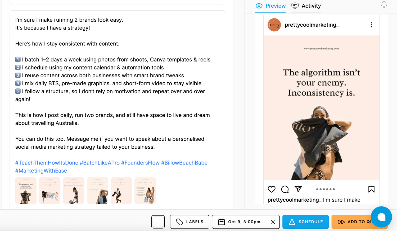 By batching 90+ posts in advance, you get variety, consistency, and strategy all in one system.